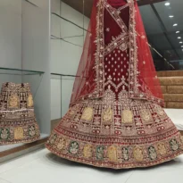 Celebrate your special day in timeless elegance with this dark red engagement lehenga that perfectly blends luxury with tradition. Crafted from premium velvet fabric, the lehenga is richly adorned with delicate hand embroidery, intricate thread work, sparkling sequins, fine zari, and shimmering stone embellishments—a masterpiece designed to make you shine.